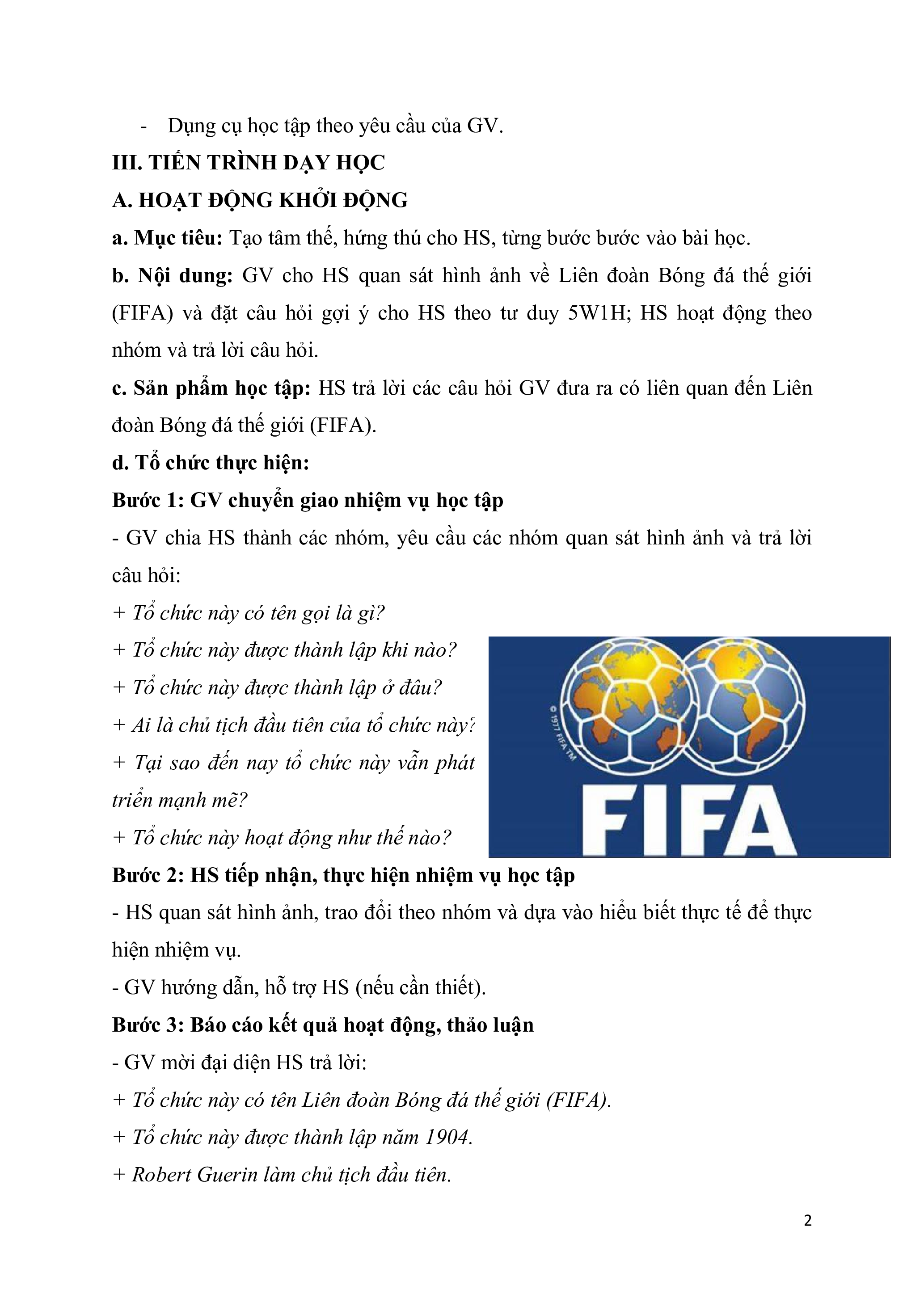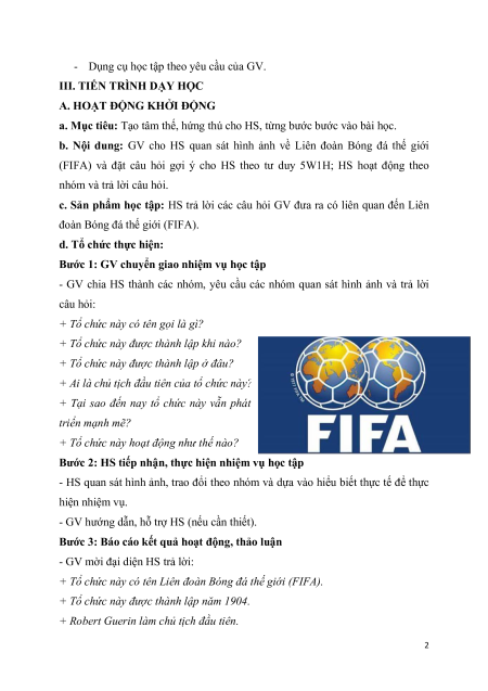 (FIFA) và đặt câu hỏi gợi ý cho HS theo tư duy 5W1H; HS hoạt động theo