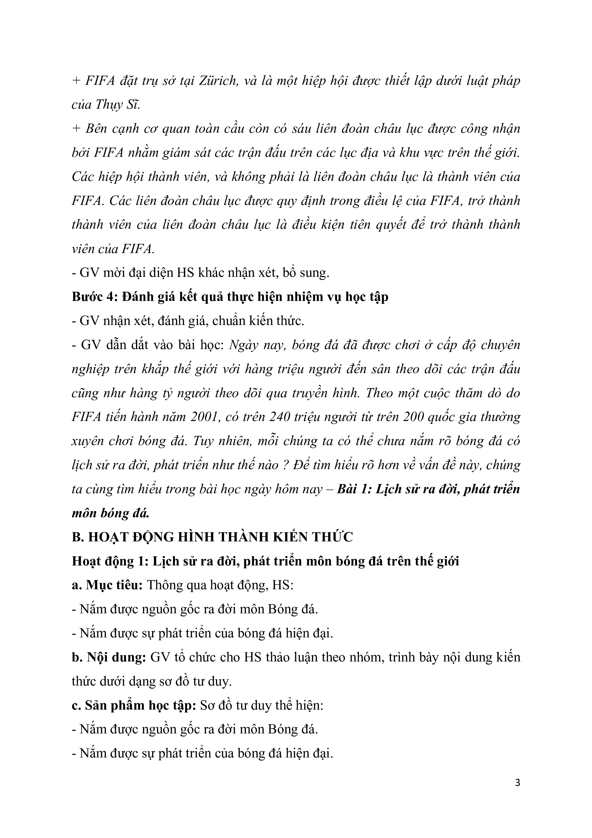 Hoạt động 1: Lịch sử ra đời, phát triển môn bóng đá trên thế giới