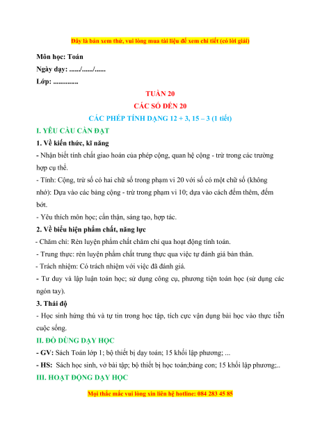 Ngày dạy: ....../....../...... Lớp: .............. TUẦN 20 CÁC SỐ ĐẾN 20