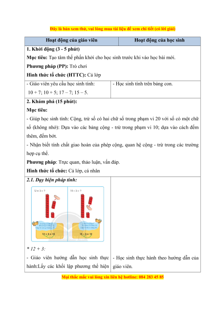 10 + 7; 10 + 5; 17 – 7; 15 – 5. 2. Khám phá (15 phút): Mục tiêu: