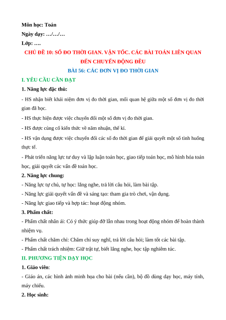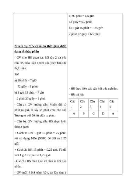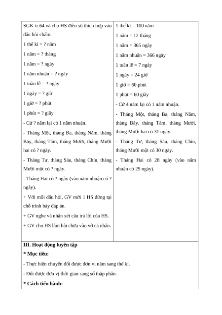 - HS thực hiện được việc chuyển đổi một số đơn vị đo thời gian.