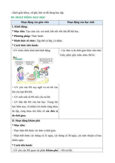 - HS nhận biết khái niệm đơn vị đo thời gian, mối quan hệ giữa một số đơn vị đo thời gian đã học.