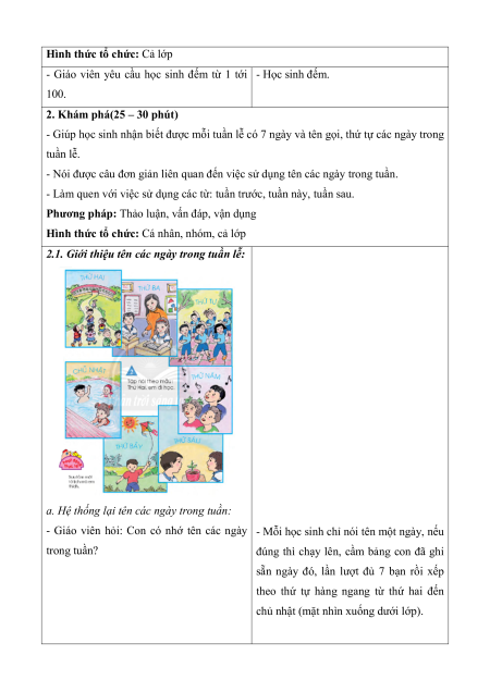 - Nhận biết được mỗi tuần lễ có 7 ngày và tên gọi, thứ tự các ngày trong tuần lễ.