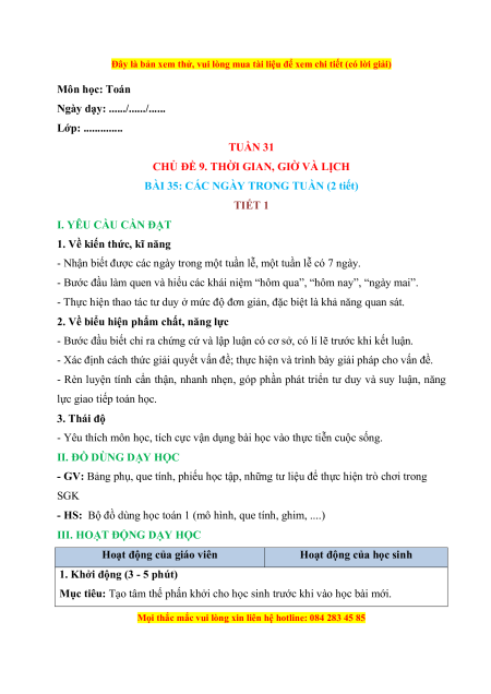 BÀI 35: CÁC NGÀY TRONG TUẦN (2 tiết) TIẾT 1 I. YÊU CẦU CẦN ĐẠT
