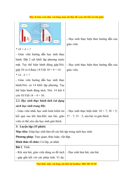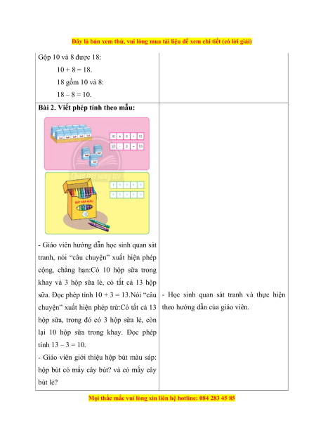 Đây là bản xem thử, vui lòng mua tài liệu để xem chi tiết (có lời giải) Gộp 10 và 8 được 18: 10 + 8 = 18. 18 gồm 10 và 8: 18 – 8 = 10.