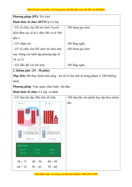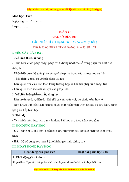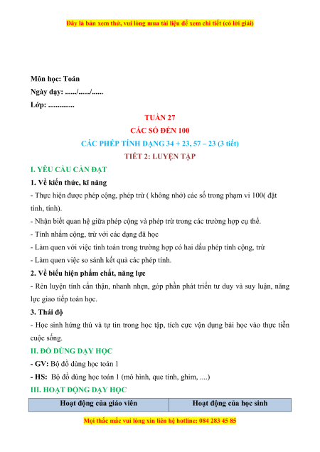 - Thực hiện được phép cộng, phép trừ ( không nhớ) các số trong phạm vi 100( đặt tính, tính).