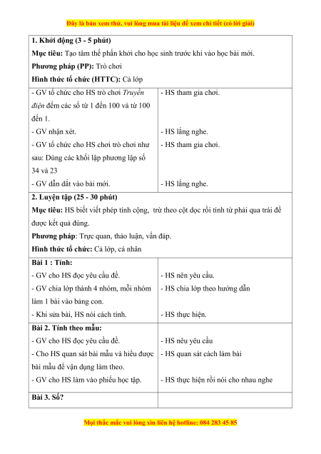 - HS biết đặt tính cộng, trừ theo cột dọc và tính đúng các phép tính.