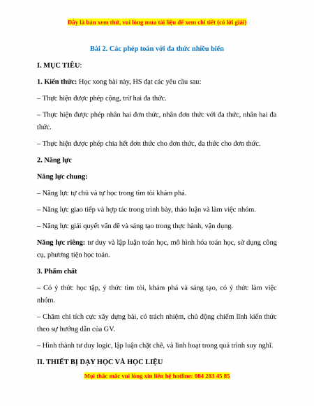 Bài 2. Các phép toán với đa thức nhiều biến I. MỤC TIÊU: