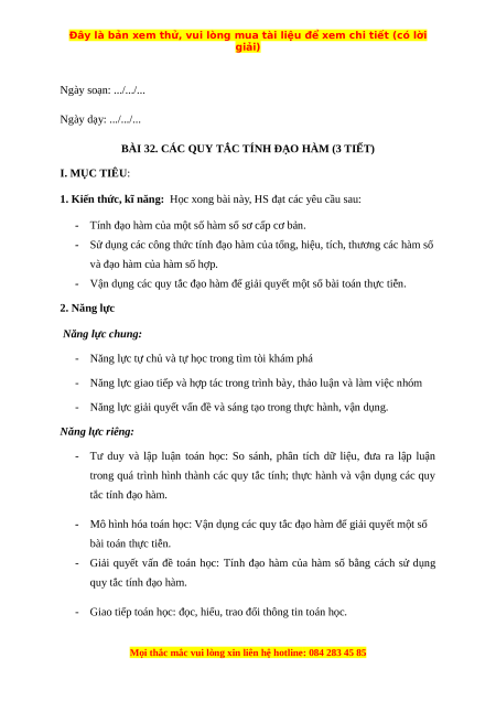 BÀI 32. CÁC QUY TẮC TÍNH ĐẠO HÀM (3 TIẾT) I. MỤC TIÊU: