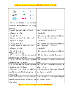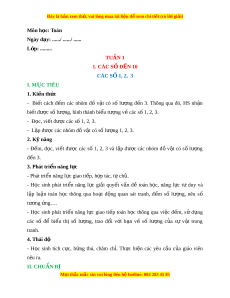 ế 3. Thông qua đó, HS nh n ậ bi t ế đư c ợ số lư ng, hì ợ nh thành bi u t ể ư ng ợ v các s ề ố 1, 2, 3. - Đ c, vi ọ t ế đư c ợ các số 1, 2, 3. - L p đ ậ ư c các ợ nhóm đ v ồ t ậ có s l ố ư ng ợ 1, 2, 3. 2. Kỹ năng - Đ m ế , đ c, ọ vi t ế đư c ợ các số 1, 2, 3 và l p ậ đư c ợ các nhóm đ ồ v t ậ có s ố lư ng ợ đ n 3. ế 3. Phát tri n nă ể ng l c ự - Phát tri n năng ể l c gi ự ao ti p, h ế p t ợ ác, t ch ự . ủ - H c ọ sinh phát tri n ể năng l c ự gi i ả quy t ế v n ấ đề toán h c, ọ năng l c ự tư duy và l p ậ lu n ậ toán h c ọ thông qua ho t ạ đ ng ộ quan sát tranh, đ m ế số lư ng, ợ nêu số tư ng ơ ng…. ứ - H c ọ sinh phát tri n ể năng l c ự giao ti p ế toán h c ọ thông qua vi c ệ đ m ế , sử d ng ụ các số để bi u ể thị số lư ng, ợ trao đ i ổ v i ớ b n ạ về số lư ng ợ c a ủ sự v t ậ trong tranh. 4. Thái độ - H c ọ sinh tích c c, ự h ng ứ thú, chăm ch .ỉ Th c ự hi n ệ các yêu c u ầ c a ủ giáo viên nêu ra. II. CHUẨN BỊ M i