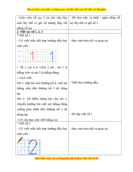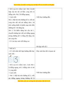 ọ sinh theo dõi và quan sát sinh vi t ế : + Số 1 cao 4 li. G m ồ 2 nét : nét 1 là th ng ẳ xiên và nét 2 là th ng ẳ đ ng. ứ + Cách vi t ế : Nét 1: Đ t ặ bút trên đư ng ờ k ẻ 4, vi t ế nét - Vi t ế theo hư ng d ớ n ẫ th ng ẳ xiên đ n ế đư ng ờ kẻ 5 thì d ng ừ l i ạ . Nét 2: Từ đi m ể d ng ừ bút c a ủ nét 1, chuy n ể hư ng ớ bút vi t ế nét th ng ẳ đ ng ứ xuống phía dư i ớ đ n ế đư ng ờ kẻ 1 thì d ng l ừ i ạ . - HS t p ậ vi t ế s 1 ố - GV cho h c s ọ inh vi t ế b ng con ả * Vi t ế số 2 - GV vi t ế m u ẫ k t ế h p ợ hư ng ớ d n ẫ h c ọ - H c
