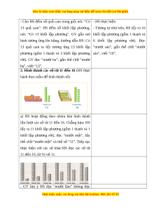 ộ theo nhóm bàn hình thành lần lư t ợ các số t ừ 11 đ n ế 16. Ch ng ẳ h n: ạ HS lấy ra 11 kh i ố l p ậ phư ng ơ (g m ồ 1 thanh và 1 khối l p ậ phư ng ơ r i ờ ), đ c ọ “mư i ờ m t ộ ”, l y ấ thẻ chữ “mư i ờ m t ộ ” và th ẻ s ố “11”. Ti p ế t c ụ th c ự hi n ệ v i ớ các số khác:HS đ c ọ các số từ 11 đ n 16, t ế 16 v ừ ề 11. - GV l u ư ý HS đ c ọ “mư i ờ lăm” không đ c ọ M i