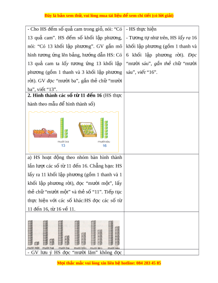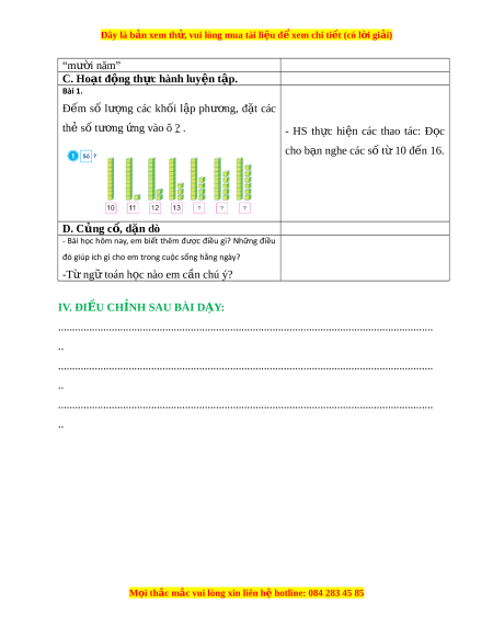 Đây là bản xem th , vu ử i lòng mua tài li u ệ đ xe ể m chi ti t (c ế ó l i ờ gi i ả ) “mư i ờ năm” C. Hoạt đ ng t ộ h c hành l ự uy n t ệ p. ậ Bài 1. Đ m ế số lư ng ợ các kh i ố l p ậ phư ng, ơ đ t ặ các thẻ số tư ng ơ ng vào ô ứ ? . - HS th c ự hi n ệ các thao tác: Đ c ọ cho b n nghe ạ các số t 10 đ ừ n ế 16. D. Củng c , ố d n dò ặ