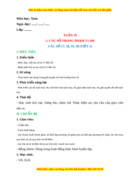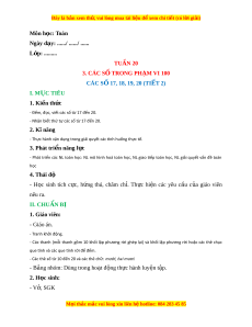 Ngày dạy: ....../ ....../ ...... L p: ớ ......... TUẦN 19 3. CÁC S Ố TRONG PH M Ạ VI 100 CÁC S 17, 18, 19, 20 ( Ố TI T Ế 1) I. M C Ụ TIÊU 1. Ki n t ế h c ứ