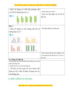 cây su hào ta lấy tư ng ơ ng ứ 18 kh i ố l p ậ phư ng ơ (g m ồ 1 thanh và 8 kh i ố l p ậ phư ng ơ r i ờ ). GV đ c ọ “mư i ờ tám”, g n ắ thẻ chữ “mư i ờ tám”, vi t ế “18”. - Tư ng ơ tự như trên, HS ho t ạ đ ng ộ theo - HS ho t ạ đ ng t ộ heo nhóm bàn nhóm bàn hình thành l n ầ lư t ợ các số từ 17 đ n ế 20, ch ng ẳ h n: ạ HS lấy ra 17 kh i ố l p ậ phư ng ơ (g m ồ 1 thanh và 7 kh i ố l p ậ phư ng ơ r i ờ ), đ c ọ “mư i ờ b y”, ả g n