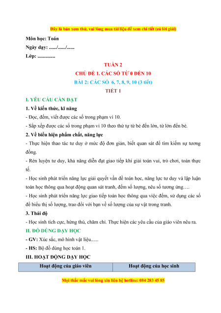 BÀI 2: CÁC SỐ 6, 7, 8, 9, 10 (3 tiết) TIẾT 1 I. YÊU CẦU CẦN ĐẠT