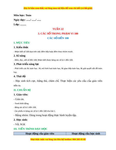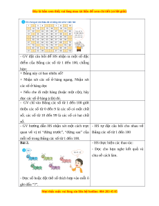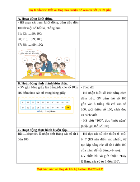 Đây là bản xem th , vu ử i lòng mua tài li u ệ đ xe ể m chi ti t (c ế ó l i ờ gi i ả ) A. Hoạt đ ng k ộ h i ở đ ng. ộ - HS quan sát tranh kh i ở đ ng, ộ đ m ế ti p ế đ n ế 100 t m ừ t ộ số bất kì, ch ng ẳ h n: ạ 81; 82; ,...;99; 100; 90; 91; ,...;99; 100; 87; 88; ....; 99; 100; B. Hoạt đ ng hì ộ nh thành ki n t ế h c. ứ - GV g n ắ băng gi y ấ lên b ng ả (đã che s ố 100), - Theo dõi HS đ m ế theo các s t ố rong băng gi y: ấ - HS nh n ậ bi t ế số 100 b ng ằ cách đ m ế ti p. ế GV c m ầ thẻ số 100 g n ắ vào ô tr ng ố r i ồ chỉ vào số 100, gi i ớ thi u ệ số 100, cách đ c ọ và cách vi t ế . - HS vi t ế “100”, đ c ọ “m t ộ trăm” (hoặc gài thẻ số 100). C. Hoạt đ ng t ộ h c hành l ự uy n t ệ p. ậ Bài 1. M c ụ tiêu là nh n bi ậ t ế B ng các ả s t ố 1 ừ - HS đ c ọ các số còn thi u ế ở m i ỗ đ n 100 ế ô ? (HS nên đi n ề vào phi u, ế tự t o ạ l p ậ b ng ả các số từ 1 đ n ế 100 c a m ủ ình đ s ể ử d ng v ụ s ề au). GV ch a ữ bài và gi i ớ thi u: ệ “Đây là B ng ả các số từ 1 đ n 100' ế '. M i