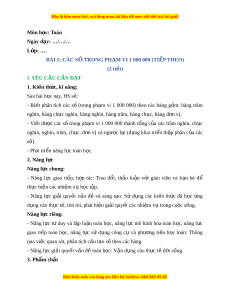 ụ nghìn, hàng nghìn, hàng trăm, hàng ch c, hàng đ ụ n ơ v . ị - Vi t ế đư c ợ các số trong ph m ạ vi 1 000 000 thành t ng ổ c a ủ các trăm nghìn, ch c ụ nghìn, nghìn, trăm, ch c, ụ đ n ơ v ịvà ngư c ợ l i ạ (d ng ạ khai tri n ể th p ậ phân c a ủ các số). - Phát tri n năng ể l c t ự oán h c. ọ 2. Năng l c ự Năng l c chung ự : - Năng l c ự giao ti p, ế h p ợ tác: Trao đ i ổ , th o ả lu n ậ v i ớ giáo viên và b n ạ bè để th c ự hi n các ệ nhi m ệ vụ h c t ọ p. ậ - Năng l c ự gi i ả quy t ế v n ấ đề và sáng t o: ạ Sử d ng ụ các ki n ế th c ứ đã h c ọ ng ứ d ng vào ụ th c t ự , t ế ìm tòi, phát hi n gi ệ i ả quy t ế các nhi m ệ v t ụ rong cu c s ộ ng. ố Năng l c ri ự êng: - Năng l c ự t ư duy và l p ậ lu n ậ toán h c, ọ năng l c ự mô hình hóa toán h c, ọ năng l c ự giao ti p ế toán h c, ọ năng l c ự sử d ng ụ công cụ và phư ng ơ ti n ệ h c ọ toán: Thông