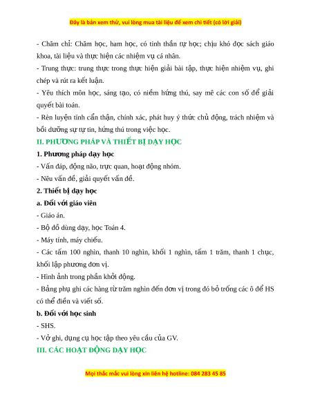 ậ chính xác, phát huy ý th c ứ chủ đ ng, ộ trách nhi m ệ và bồi dư ng s ỡ ự t t ự in, h ng t ứ hú trong vi c h ệ c. ọ II. PHƯ N Ơ G PHÁP VÀ THI T Ế B D Ị Y Ạ H C Ọ 1. Phư ng ơ pháp d y h ạ c ọ - Vấn đáp, đ ng ộ não, tr c ự quan, ho t ạ đ ng nhóm ộ . - Nêu vấn đ , gi ề i ả quy t ế v n đ ấ . ề 2. Thi t ế b d ị y h ạ c ọ a. Đ i ố v i ớ giáo viên - Giáo án. - Bộ đồ dùng d y ạ , h c ọ Toán 4. - Máy tính, máy chi u. ế - Các t m