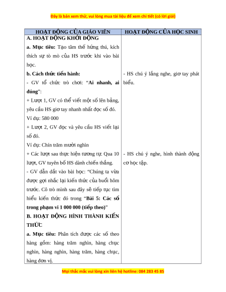 ơ : “Ai nhanh, ai bi u. ể đúng”: + Lư t ợ 1, GV có thể vi t ế m t ộ s ố lên b ng, ả yêu cầu HS gi t ơ ay nhanh nh t ấ đ c ọ s đó. ố Ví d : ụ 580 000 + Lư t ợ 2, GV đ c ọ và yêu c u ầ HS vi t ế l i ạ số đó. Ví d : ụ Chín trăm mư i ờ nghìn + Các lư t ợ sau th c ự hi n ệ tư ng ơ t .
