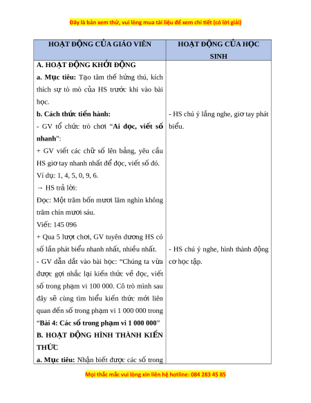 HOẠT Đ N Ộ G C A Ủ GIÁO VIÊN HOẠT Đ N Ộ G C A Ủ H C Ọ SINH A. HOẠT Đ N Ộ G KH I Ở Đ N Ộ G a. M c ụ tiêu: T o ạ tâm thế h ng ứ thú, kích thích sự tò mò c a ủ HS trư c ớ khi vào bài h c. ọ b. Cách th c ứ ti n hàn ế h: - HS chú ý l ng ắ nghe, gi ơ tay phát - GV tổ ch c ứ trò ch i ơ “Ai đ c, ọ vi t ế số bi u. ể nhanh”: + GV vi t ế các chữ số lên b ng, ả yêu c u ầ HS gi t ơ ay nhanh nh t ấ đ đ ể c, ọ vi t ế s đó. ố Ví d : ụ 1, 4, 5, 0, 9, 6. → HS tr l ả i ờ : Đ c: ọ M t ộ trăm b n ố mư i ơ lăm nghìn không trăm chín mư i ơ sáu. Vi t ế : 145 096 + Qua 5 lư t ợ ch i ơ , GV tuyên dư ng ơ HS có số lần phát bi u nhanh nh ể ất, nhi u nh ề ất.
