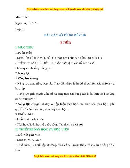 Ngày dạy: .../.../... L p: ớ ... BÀI: CÁC S Ố T 101 Đ Ừ N Ế 110 (2 TIẾT) I. M C Ụ TIÊU 1. Ki n t ế h c ứ - Đ m ế , l p s ậ ố, đ c, vi ọ t ế , c u t ấ o t ạ h p ậ phân c a các ủ s t ố 101 đ ừ n 1 ế 10 - Th t ứ các ự số t 101 đ ừ n 1 ế 10, nh n bi ậ t ế v t ị rí các s t ố rên tia s . ố - Làm quen kho ng t ả h i ờ gian. 2. Năng l c ự