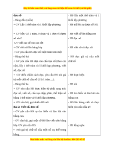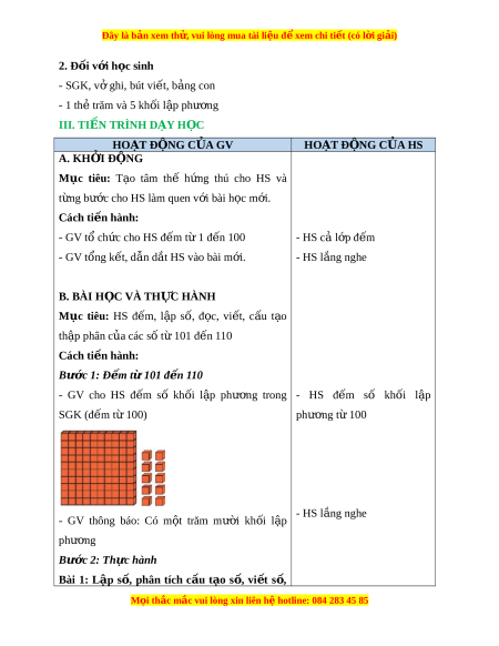 Đây là bản xem th , vu ử i lòng mua tài li u ệ đ xe ể m chi ti t (c ế ó l i ờ gi i ả ) 2. Đ i ố v i ớ h c s ọ inh - SGK, v ghi ở , bút vi t ế , b ng con ả - 1 th t ẻ răm và 5 kh i ố l p ph ậ ư ng ơ III. TI N Ế TRÌNH D Y Ạ H C Ọ HOẠT Đ N Ộ G C A Ủ GV HOẠT Đ N Ộ G C A Ủ HS A. KH I Ở Đ N Ộ G Mục tiêu: T o ạ tâm thế h ng ứ thú cho HS và t ng b ừ ư c ớ cho HS làm quen v i ớ bài h c ọ m i ớ . Cách ti n hà ế nh: - GV tổ ch c ứ cho HS đ m ế t 1 đ ừ n 100 ế - HS cả l p đ ớ m ế - GV tổng k t ế , d n d ẫ t ắ HS vào bài m i ớ . - HS l ng ắ nghe B. BÀI H C Ọ VÀ TH C Ự HÀNH Mục tiêu: HS đ m ế , l p ậ s , ố đ c, ọ vi t ế , c u ấ t o ạ th p ậ phân c a các ủ số t 101 đ ừ n 1 ế 10 Cách ti n hà ế nh: Bước 1: Đ m ế t 101 đ ừ n 1 ế 10 - GV cho HS đ m ế số kh i ố l p ậ phư ng ơ trong - HS đ m ế số kh i ố l p ậ SGK (đ m ế t 100) ừ phư ng t ơ 100 ừ - HS l ng ắ nghe - GV thông báo: Có m t ộ trăm mư i ờ kh i ố l p ậ phư ng ơ