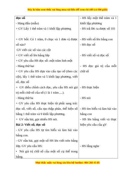 Đây là bản xem th , vu ử i lòng mua tài li u ệ đ xe ể m chi ti t (c ế ó l i ờ gi i ả ) đ c ọ số - HS l y ấ m t ộ thẻ trăm và 1 - Hàng đầu (mẫu) khối l p ậ phư ng ơ + GV L y 1 t ấ h t ẻ răm và 1 kh i ố l p ậ phư ng ơ - HS tr l ả i ờ : ta dư c ợ s 101 ố + GV h i ỏ : Có 1 trăm, 0 ch c ụ và 1 đ n ơ vị đư c ợ - HS vi t ế số lên b ng con ả số nào? - HS đ c ọ số GV vi t ế các số vào các c t ộ + GV vi t ế s l ố ên b ng ả l p ớ - HS vi t ế số và đ c s ọ ố + GV yêu c u H ầ S đ c ọ số: m t ộ trăm linh m t ộ - Hàng th hai ứ - HS đ c ọ giá trị c a ủ m i ỗ + GV yêu c u ầ HS d a ự vào c u ấ t o ạ số (theo các ch s ữ ố c t
