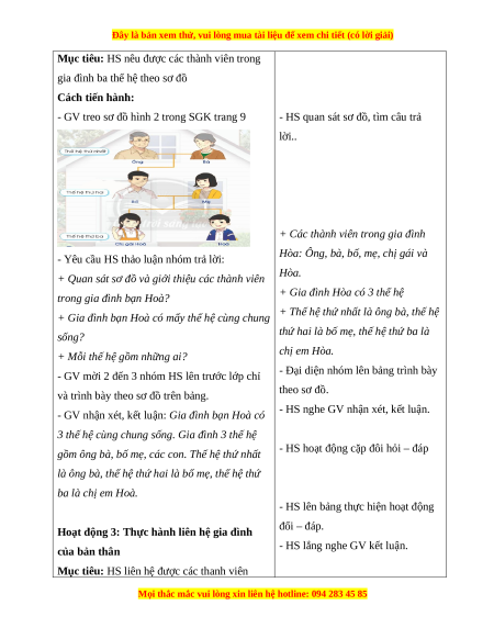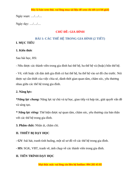 BÀI 1: CÁC THẾ HỆ TRONG GIA ĐÌNH (2 TIẾT) I. MỤC TIÊU 1. Kiến thức Sau bài học, HS: