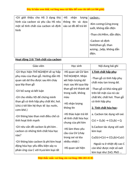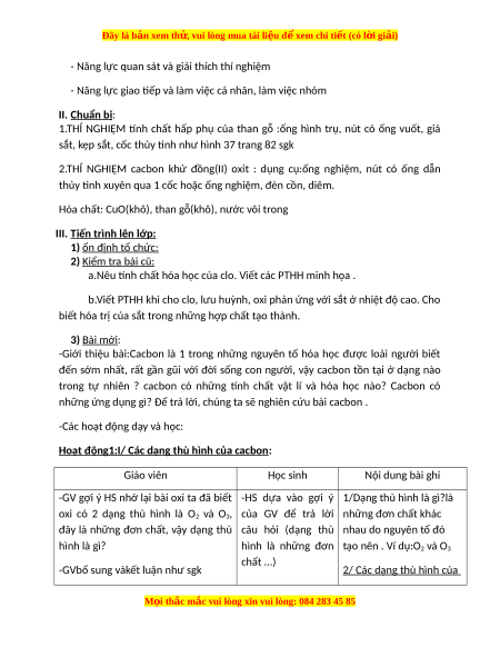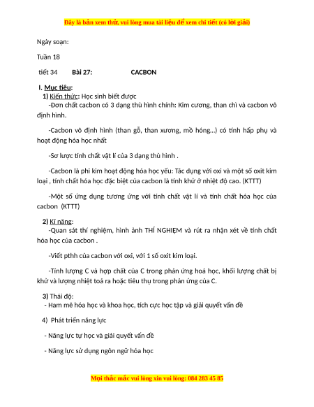 Đây là bản xem th , vu ử i lòng mua tài li u ệ đ xe ể m chi ti t (c ế ó l i ờ gi i ả ) Ngày soạn: Tuần 18 tiết 34 Bài 27: CACBON I. M ục tiêu : 1) K
