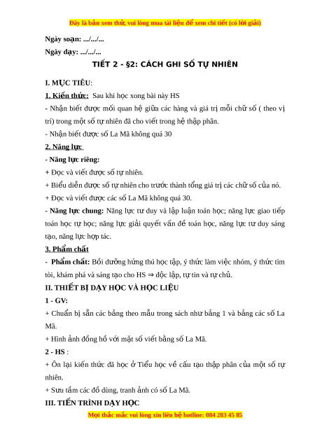 II. THIẾT BỊ DẠY H C Ọ VÀ H C Ọ LI U Ệ 1 - GV: + Chu n ẩ bị s n ẵ các b ng ả theo m u ẫ trong sách như b ng ả 1 và b ng ả các s ố La Mã. + Hình nh đ ả ng h ồ v ồ i ớ m t ặ s vi ố t ế b ng ằ s L ố a Mã. 2 - HS : + Ôn l i ạ ki n ế th c ứ đã h c ọ ở Ti u ể h c ọ về c u ấ t o ạ th p ậ phân c a ủ m t ộ số tự nhiên. + S u t
