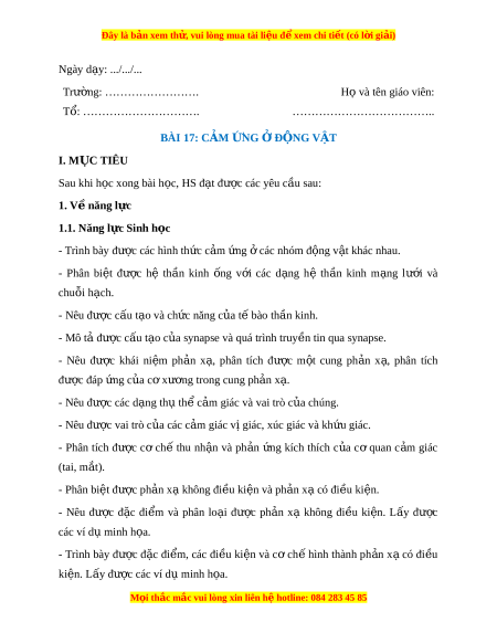 ……………………………….. BÀI 17: CẢM N Ứ G Đ Ở N Ộ G V T Ậ I. M C Ụ TIÊU Sau khi h c ọ xong bài h c, H ọ S đ t ạ được các yêu c u s ầ au: 1. V năng l ề c ự 1.1. Năng l c Si ự nh h c ọ - Trình bày đư c các ợ hình th c c ứ m ả ng ứ các nhóm ở đ ng ộ v t ậ khác nhau. - Phân bi t ệ đư c ợ hệ th n ầ kinh ng ố v i ớ các d ng ạ hệ th n ầ kinh m ng ạ lư i ớ và chuỗi h ch. ạ - Nêu đư c ợ c u t ấ o và ch ạ c ứ năng c a t ủ bào ế th n ki ầ nh. - Mô tả đư c c ợ ấu t o ạ c a s