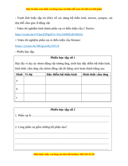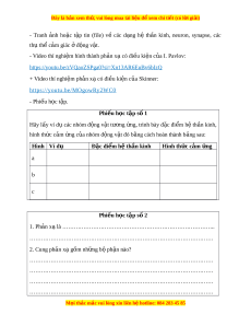 https://youtu.be/zVQaoZSPga0?si=Xn13AR6EuBv6bIzQ + Video thí nghi m ệ ph n x ả có đi ạ u ki ề n c ệ a Ski ủ nner: https://youtu.be/MOgowRy2WC0 - Phi u h ế c t ọ p. ậ Phi u h ế c t ọ p s ậ 1 ố Hãy lấy ví d các ụ nhóm đ ng v ộ t ậ tư ng ơ ng, ứ trình bày đ c ặ đi m ể h t ệ h n ầ kinh, hình th c c ứ m ả ng c ứ a ủ nhóm đ ng v ộ t ậ đó b ng ằ cách hoàn thành b ng s ả au: Hình Ví dụ Đặc đi m ể h t ệ h n ki ầ nh Hình th c c ứ m ả ng ứ a b c Phi u h ế c t ọ p s ậ 2 ố 1. Ph n ả x l