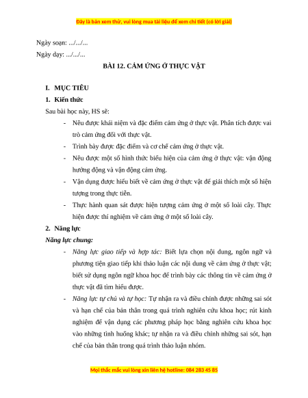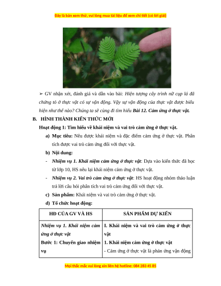 BÀI 12. CẢM ỨNG Ở THỰC VẬT I. MỤC TIÊU 1. Kiến thức Sau bài học này, HS sẽ: