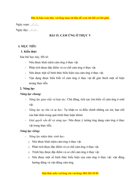 BÀI 15. CẢM ỨNG Ở THỰC V I. MỤC TIÊU 1. Kiến thức Sau bài học này, HS sẽ: