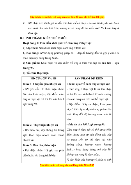 c) Sản phẩm: Khái niệm và đặc điểm về ứng ở thực vật đáp án câu hỏi 1 sgk trang 93. d) Tổ chức thực hiện HĐ CỦA GV VÀ HS SẢN PHẨM DỰ KIẾN