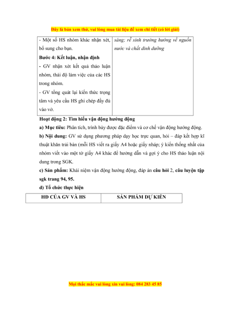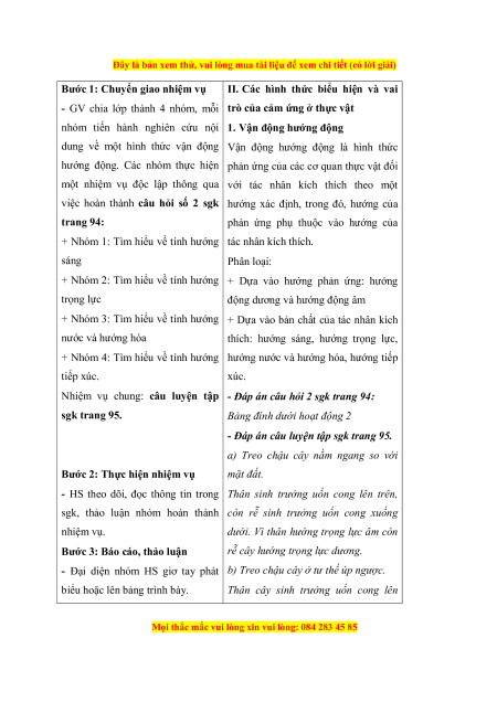 c) Sản phẩm: Khái niệm vận động hướng động, đáp án câu hỏi 2, câu luyện tập sgk trang 94, 95. d) Tổ chức thực hiện HĐ CỦA GV VÀ HS SẢN PHẨM DỰ KIẾN