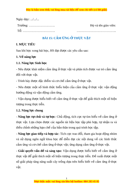 ……………………………….. BÀI 15: CẢM N Ứ G Ở TH C Ự VẬT I. M C Ụ TIÊU Sau khi h c ọ xong bài h c, H ọ S đ t ạ được các yêu c u s ầ au: 1. V năng l ề c ự 1.1. Năng l c Si ự nh h c ọ - Nêu đư c ợ khái ni m ệ c m ả ng ứ ở th c ự v t ậ và phân tích đư c ợ vai trò c m ả ng ứ đối v i ớ th c v ự t ậ . - Trình bày đư c đ ợ c ặ đi m ể và c ch ơ ế c m ả ng ứ t ở h c v ự t ậ . - Nêu đư c ợ m t ộ số hình th c ứ bi u ể hi n ệ c a ủ c m ả ng ứ ở th c ự v t ậ : v n ậ đ ng ộ hư ng ớ đ ng và v ộ n ậ đ ng c ộ m ả ng. ứ - V n ậ d ng ụ đư c ợ hi u ể bi t ế v ề c m ả ng ứ ở th c ự v t ậ đ ể gi i ả thích m t ộ s ố hi n ệ tư ng ợ trong th c t ự i n. ễ 1.2. Năng l c chung ự - Năng l c ự t ự ch ủ và t ự h c ọ : Chủ đ ng, ộ tích c c ự t ự tìm hi u ể v ề c m ả ng ứ ở th c ự v t ậ . L a ự ch n ọ đư c ợ các ngu n ồ tài li u ệ h c ọ t p ậ phù h p, ợ tự nh n ậ ra và đi u ch ề ỉnh nh ng h ữ n ạ ch c ế a ủ b n t ả hân trong quá trình h c ọ t p. ậ - Năng l c ự giao ti p ế và h p ợ tác: Tích c c ự trao đ i ổ , tham gia ho t ạ đ ng ộ nhóm và sử d ng ụ ngôn ngữ khoa h c ọ để di n ễ đ t ạ các n i ộ dung về các hình th c ứ c m ả ng và c ứ ơ ch c ế m ả ng ứ t ở h c v ự t ậ ; ng d ứ ng c ụ m ả ng ứ t ở h c v ự t ậ . - Giải quy t ế v n