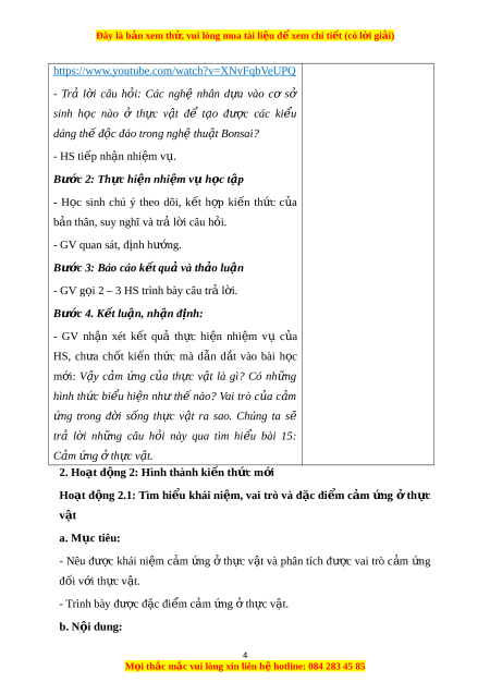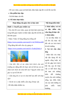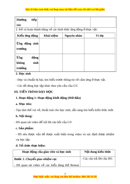 Đây là bản xem th , vu ử i lòng mua tài li u ệ đ xe ể m chi ti t ế (có l i ờ gi i ả ) Hư ng ớ ti p ế xúc 2. Ke và hoàn thành b ng v ả các ề hình th c ứ ng đ ứ ng ộ t ở h c v ự t ậ : Ki u ể ng đ ứ ng ộ Khái ni m ệ Nguyên nhân Ví dụ ng Ứ đ ng ộ sinh trư ng ở ng Ứ đ ng ộ không sinh trư ng ở 2. H c ọ sinh - Đ c và chu ọ n b â bài i , tìm hi u t ể rư c t ớ hông tin v c ề m ả ng ứ t ở h c v ự t ậ . - Các đồ dùng h c ọ t p khác t ậ heo yêu c u c ầ a G ủ V. III. TI N Ê TRÌNH D Y A H C O 1. Hoạt đ ng 1 ộ : Ho t ạ đ ng ộ kh i ở đ ng ( ộ M đ ở u) ầ a. Mục tiêu: - T o t ạ âm th vui ế v , t e ho i ả mái cho h c s ọ inh, s n ẵ sàng tìm hi u ki ể n t ế h c m ứ i ớ . b. N i ộ dung: - HS quan sát video đ t ể r l ả i ờ câu h i ỏ c a ủ GV. c. Sản phẩm: - HS nêu đư c ợ v n ấ đề đư c ợ xu t ấ hi n ệ trong video và xác đ nh i đư c ợ nhi m ệ v h ụ c ọ t p ậ d. T ch ổ ức thực hi n: ệ Hoạt đ ng c ộ a g ủ iáo viên và h c ọ sinh N i ộ dung ki n t ế h c ứ Bư c ớ 1. Chuy n gi ể ao nhi m ệ v : ụ - Các câu trả l i ờ c a ủ HS: