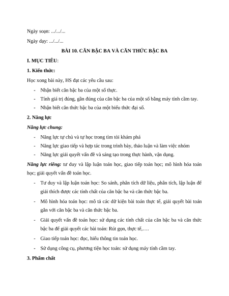 BÀI 10. CĂN BẬC BA VÀ CĂN THỨC BẬC BA I. MỤC TIÊU: