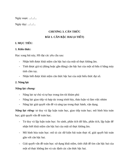 BÀI 1. CĂN BẬC HAI (4 TIẾT) I. MỤC TIÊU: