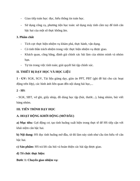- Sử dụng công cụ, phương tiện học toán: sử dụng máy tính cầm tay để tính căn