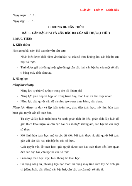 Giáo án – Toán 9 – Cánh diều Ngày soạn: .../.../... Ngày dạy: .../.../...