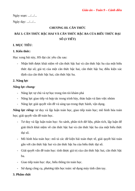 BÀI 3. CĂN THỨC BẬC HAI VÀ CĂN THỨC BẬC BA CỦA BIỂU THỨC ĐẠI SỐ (3 TIẾT) I. MỤC TIÊU: