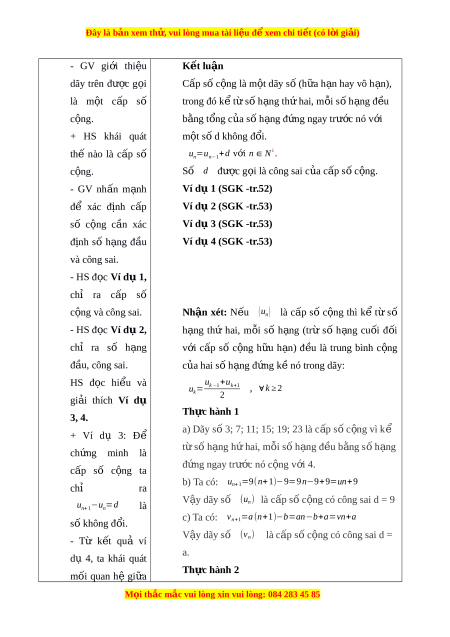 Đây là bản xem th , vu ử i lòng mua tài li u ệ đ xe ể m chi ti t ế (có l i ờ gi i ả ) - GV gi i ớ thi u ệ Kết lu n ậ dãy trên đ c ượ g i ọ C p ấ số c n ộ g là m t ộ dãy s ố (h a ữ h n ạ hay vô h n ạ ), là m t ộ c p ấ số trong đó k ể t ừ s ố h n ạ g th ứ hai, m i ỗ s ố h n ạ g đ u ề c n ộ g. b n ằ g tổng c a ủ s ố h n ạ g đ n ứ g ngay tr c ướ nó v i ớ + HS khái quát m t ộ s ố d không đ i ổ . thế nào là c p ấ số u ớ n n=u n ∈ N¿ . −1+ d v i c n ộ g. Số d đ c ượ g i ọ là công sai c a ủ c p ấ s ố c n ộ g. - GV nh n ấ m n ạ h Ví d ụ 1 (SGK -tr.52) để xác đ n ị h c p ấ Ví d ụ 2 (SGK -tr.53) số c n ộ g c n ầ xác Ví d ụ 3 (SGK -tr.53) đ n ị h số h n ạ g đ u ầ Ví d ụ 4 (SGK -tr.53) và công sai. - HS đ c ọ Ví dụ 1, chỉ ra c p ấ số c n ộ g và công sai. Nh n ậ xét: N u ế (un) là c p ấ số c n ộ g thì kể từ số - HS đ c ọ Ví dụ 2, h n ạ g thứ hai, m i ỗ số h n ạ g (trừ số h n ạ g cu i ố đ i ố chỉ ra số h n ạ g v i ớ c p ấ số c n ộ g h u ữ h n ạ ) đ u ề là trung bình c n ộ g đ u ầ , công sai. c a ủ hai s ố h n ạ g đ n ứ g k ề nó trong dãy: HS đ c ọ hi u ể và u u k −1 +uk+1 , k= ∀ k ≥ 2 gi i ả thích Ví dụ 2 Th c ự hành 1 3, 4. a) Dãy s