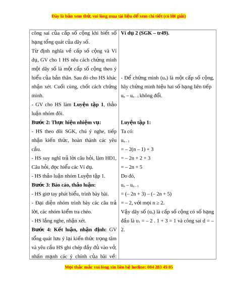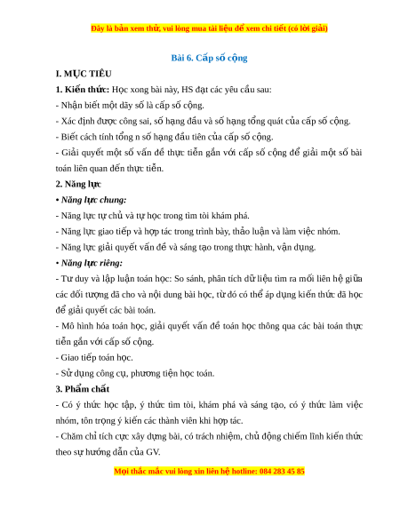 Đây là bản xem th , vu ử i lòng mua tài li u ệ đ xe ể m chi ti t (c ế ó l i ờ gi i ả ) Bài 6. Cấp số c ng ộ I. M C Ụ TIÊU 1. Ki n t ế h c ứ : H c ọ xong bài này, HS đ t ạ các yêu c u s ầ au: - Nh n ậ bi t ế m t ộ dãy số là c p s ấ ố c ng. ộ - Xác định đư c công s ợ ai, số h ng ạ đ u và s ầ ố h ng t ạ ổng quát c a c ủ p s ấ c ố ng. ộ - Bi t