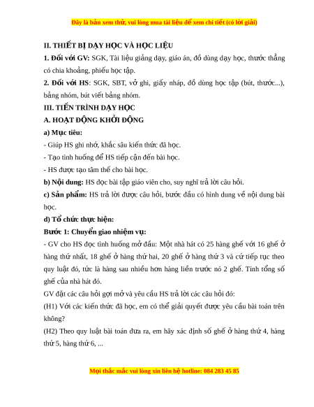 ấ , 18 ghế ở hàng thứ hai, 20 ghế ở hàng thứ 3 và cứ ti p ế t c ụ theo quy lu t ậ đó, t c ứ là hàng sau nhi u ề h n ơ hàng li n ề trư c ớ nó 2 gh . ế Tính t ng ổ số gh c ế a nhà ủ hát đó. GV đ t ặ các câu h i ỏ g i ợ m và yêu ở c u H ầ S tr l ả i ờ các câu h i ỏ đó: (H1) V i ớ các ki n ế th c ứ đã h c, ọ em có thể gi i ả quy t ế đư c ợ yêu c u ầ bài toán trên không? (H2) Theo quy lu t ậ bài toán đ a ư ra, em hãy xác đ nh
