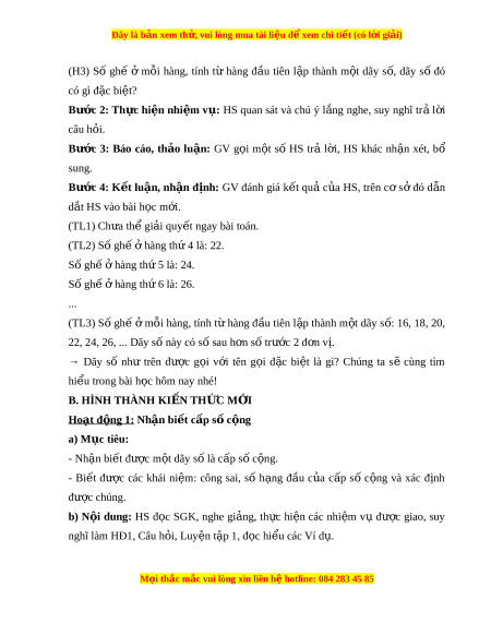 ị h: GV đánh giá k t ế quả c a ủ HS, trên c ơ s ở đó d n ẫ d t ắ HS vào bài h c ọ m i ớ . (TL1) Ch a ư th gi ể i ả quy t ế ngay bài toán. (TL2) Số ghế hàng t ở h 4 l ứ à: 22. Số gh ế ở hàng th 5 l ứ à: 24. Số gh ế ở hàng th 6 l ứ à: 26. ... (TL3) S ố ghế ở m i ỗ hàng, tính t ừ hàng đ u ầ tiên l p ậ thành m t ộ dãy s : ố 16, 18, 20,