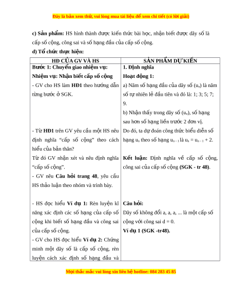 B. HÌNH THÀNH KI N Ế TH C Ứ M I Ớ Hoạt đ ng 1: ộ Nhận bi t ế c p s ấ c ố ng ộ a) M c t ụ iêu: - Nh n ậ bi t ế đư c ợ m t ộ dãy s l ố à c p s ấ c ố ng. ộ - Bi t ế đư c ợ các khái ni m ệ : công sai, số h ng ạ đ u ầ c a ủ c p ấ số c ng ộ và xác đ nh ị đư c chúng. ợ b) N i ộ dung: HS đ c ọ SGK, nghe gi ng, ả th c ự hi n ệ các nhi m ệ v ụ đư c ợ giao, suy nghĩ làm HĐ1, Câu h i ỏ , Luy n t ệ p 1, đ ậ c ọ hi u các ể Ví d . ụ M i