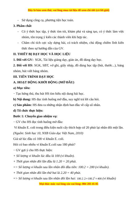 Tổng quát: Số lượng vi khuẩn sau lần nhân đôi thứ n (sau n. 20 phút) là: 100.2n (vi khuẩn).